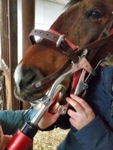 Mais voilà qu’il y a environ une bonne semaine, elle ne mangeait presque plus, donc plus de trop de crottins, mais elle était pas déshydratée. A part, ça elle continue de vouloir aller dehors au frette (oui car en ce moment on est dans nos -25 à -30 ! Au Québec icitte !  Elle reste juste à regarder le paysage, ne mange pas. Que peut-elle bien avoir ? Les dents probablement ! Et bien après visite de la vétérinaire : pas de problèmes de dents et étonnamment elle en a encore beaucoup et qui tiennent bien. Par contre, elle a probablement mal à l’articulation de la mâchoire. Oui, peut-être un peu fatiguée de mâcher cette mandibule-là !